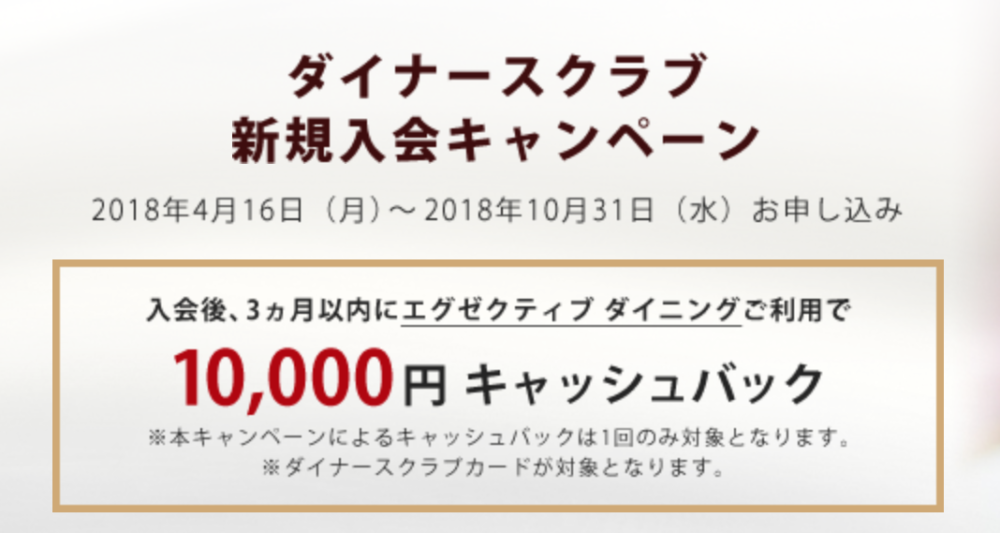 下記の通り、2018年10月31日までに加入し、入会後3ヶ月以内にエグゼクティブ ダイニングの利用で10,000円のキャッシュバックがされます。